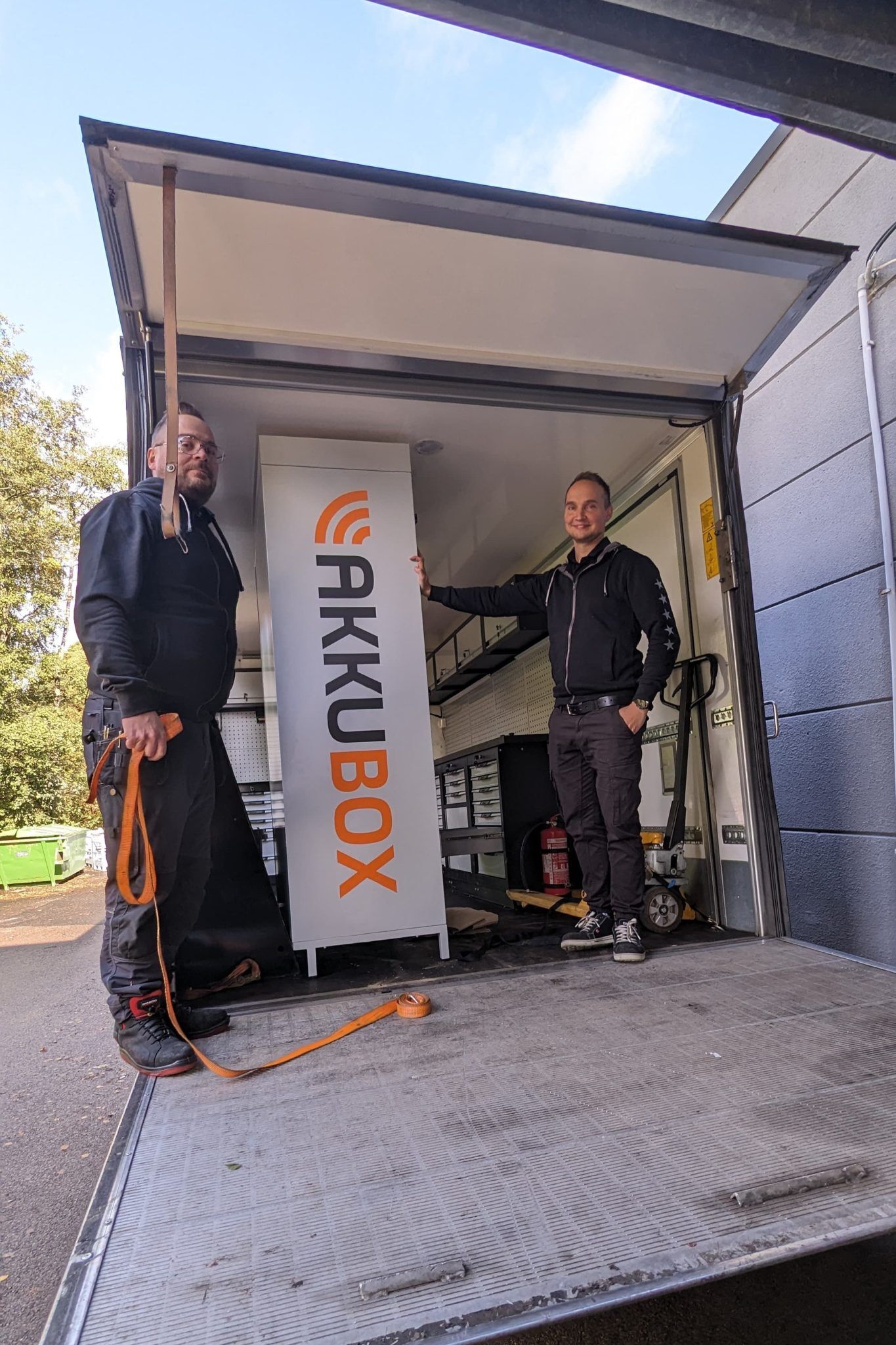 Kompaktin kokonsa vuoksi älykaapit on helppo toimittaa asiakkaalle, kuten Rauman Akun Tomi Salo (vas.) ja Jarkko Uusitalo näyttävät.